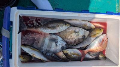 コメント: イサキメインのオキアミ五目で出船しました。マダイ、イシダイ、メイチ、グレなど混ざって良く釣れました、ふつうにイサキ釣りも出ますので、予約、問い合わせなど