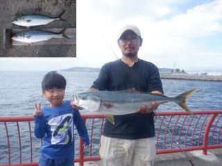 メジロ | 67〜68.5cm | 2匹 | ウキ釣り 伊勢尼12号針 ハリス6号 オモリ40号 竿5.3m 中層 | アジ |