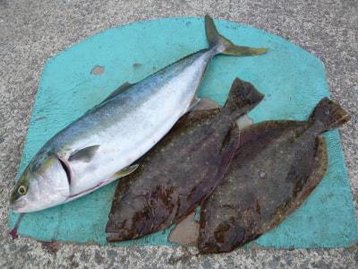 沖一文字外、ブリ、1本、86cm、ヒラメ、2枚、56cm、飲ませ釣り 神戸市、西本さん |