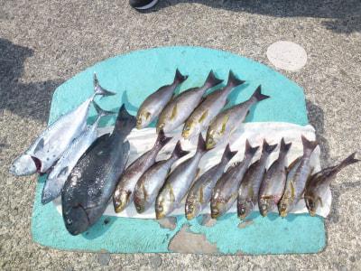 沖一文字外、ヤイトガツオ、2本、38〜43cm、グレ、1枚、43cm、30cm迄のイサギ、13枚、かご釣り 香芝市、今井さん |