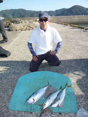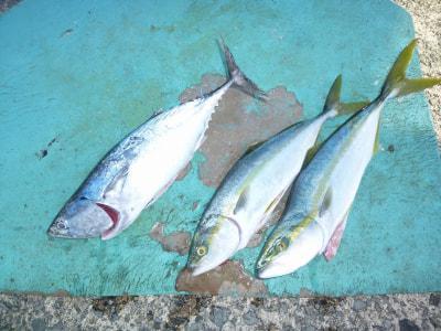 沖一文字外、ヤイトガツオ、1本、43cm、ハマチ、2本、43cm、かご釣り 八尾市、大野さんの釣果 |