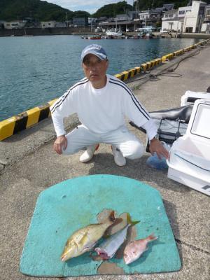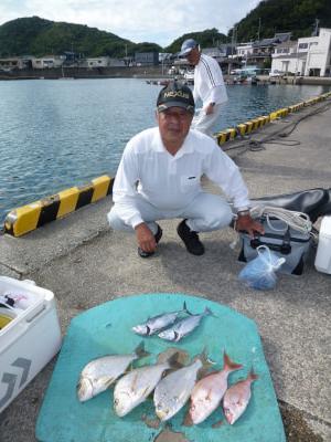 神谷一文字、マダイ、1枚、32cm、他、ヘダイ、チャリコ、小ヤイトなど、かご釣り 海南市、森脇さん |