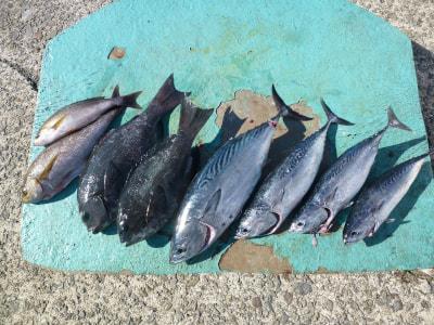 沖一文字内、ヤイトガツオ、1本、42cm、グレ、2枚、32〜39cm、他、イサギ、平ソーダ、丸ソーダなど、かご釣り 柏原市、尾島さん |