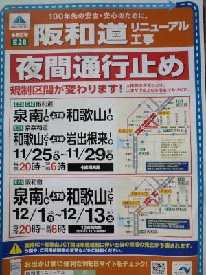 12月8日夜〜13日朝迄、阪和道泉南〜和歌山間、夜間通行止めです。ご注意下さい。 |