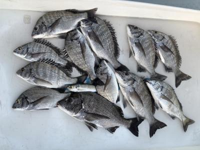 チヌ | 24〜37cm | 12匹 | 竿1,4mハリス1,7号チヌ針4号 | シラサ、サナギ、コーン |