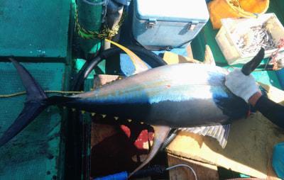 キハダフカセ狙い 3回ヒットで40kgあるか無いかのが1本釣れました リールトラブルで切れたのと あと30mくらいで外れました これは60kgくらいの引きでしたが残念でした |