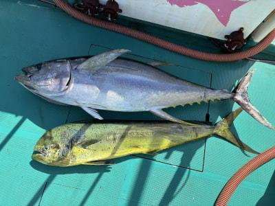 | 今日は2隻でキハダフカセに出船、1隻はアタリ無く撃沈😭 1隻はアタリ三回でキハダ35.6キロ、サメが一回、シイラ10キロオーバーでした。本日もご乗船いただきありがとうございました🙇 |