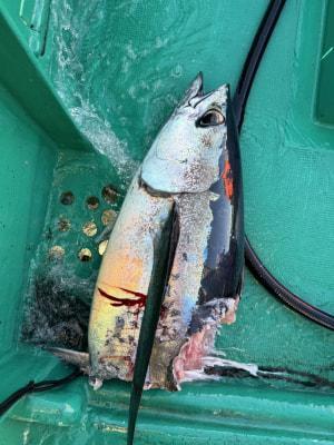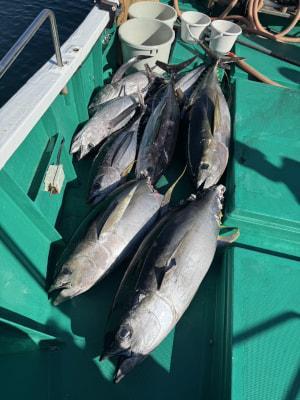 | キハダフカセに出船、今日はアタリが多くキハダ6ヒットで58キロ、サメにかじられた2匹、48キロ、31キロとビンチョウも6ヒットで5匹半でした。本日もご乗船いただきありがとうございました🙇 |