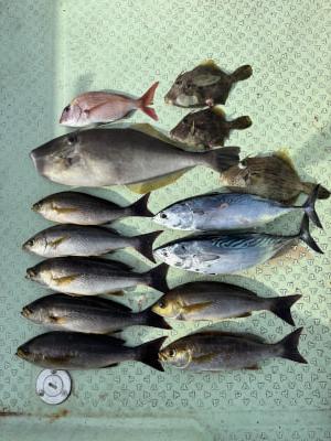 | 伝馬船釣果、イサギ、ヤイト、カワハギ、アカハタ、などが釣れてました 船外機、ルアーで、真鯛、シオ、オオモンハタなどが釣れてました。 |