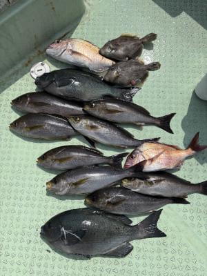 | 伝馬船釣果、イサギ、グレ、コダイなどが釣れてました。 船外機釣果、オオモンハタ、ブリなどが釣れてました。 |