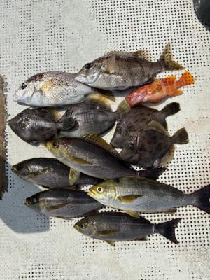 | 伝馬船釣果、オオモンハタ、イサギ、カワハギ、メイチなどが釣れてました。 |