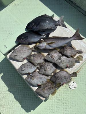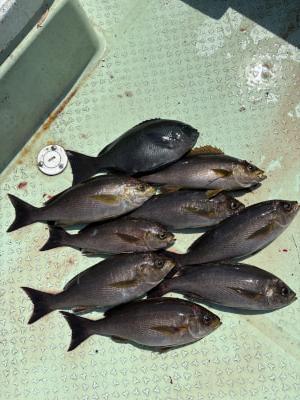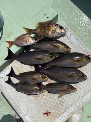 | 伝馬船釣果、イサギ、グレ、メイチ、カワハギなどが釣れてました。 |