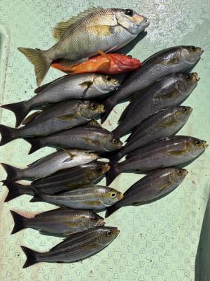 伝馬船釣果、イサギ、メイチ、アカハタなどが釣れてました。 |