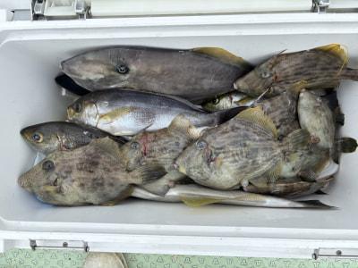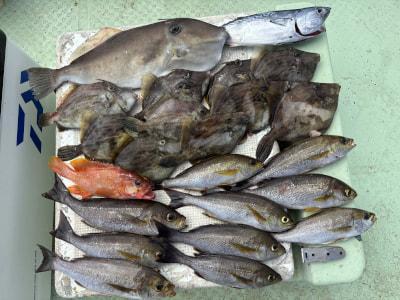伝馬船釣果、イサギ、ヤイト、カワハギ、ウスバ、アカハタなどが釣れてました。 船外機、ルアーでオオモンハタ、メジロなどが釣れてました。 |