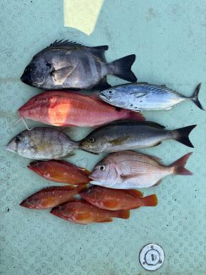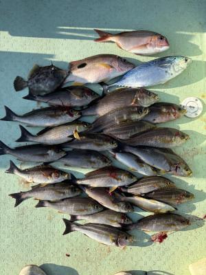 | 伝馬船釣果イサギ、ヤイト、カワハギアカハタ、コロ鯛、メイチ、グレなどが釣れてました。 |