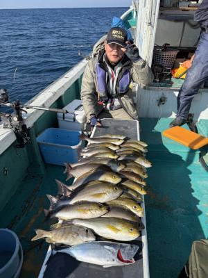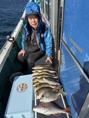 | 五目釣りに出船しました、イサギは爆釣でしたメイチダイ、真鯛も釣れ大漁でした、天秤オキアミカゴ〔小さめ)持参して下さいね、無料貸し道具ありますが落とした場合2000円頂いています、22日まだお客様いません遊びに来て下さい、よろしくお願いします、お疲れ様でした! |
