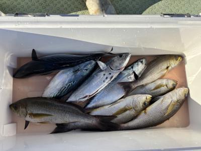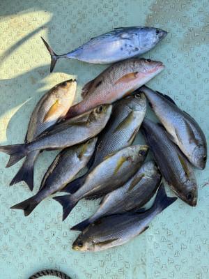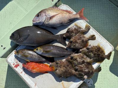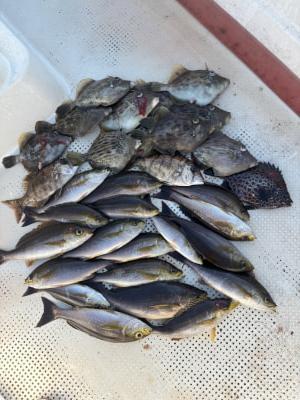 | 伝馬船釣果、イサギ、ヤイト、カワハギ、グレ、真鯛などが釣れてました。 |