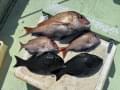 | 伝馬船釣果、イサギ、カワハギ、などが釣れてました。 船外機釣果、ルアーで真鯛ゲット! |