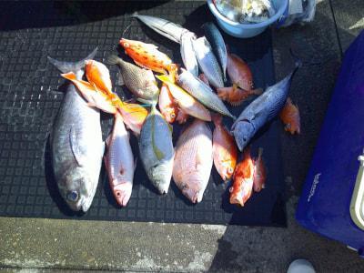 | 前半シマアジ狙い後半は自由時間で出船。今日もシマアジは喰い渋かったですが、何とか3枚釣れました。後半もウロウロでした。 |