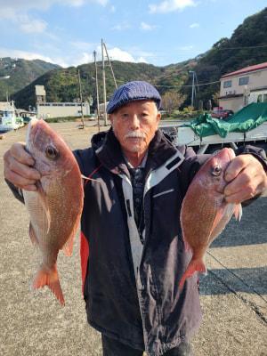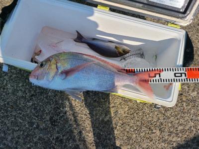 マダイ | 37〜46cm | 2匹 | 竿釣り 天秤フカセ ハリス5〜6号 4,5〜6b(3ヒロ〜4ヒロ)まで マダイ針10、11号 おもり100、120 オキアミ用コマセカゴ | オキアミ |