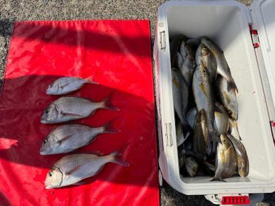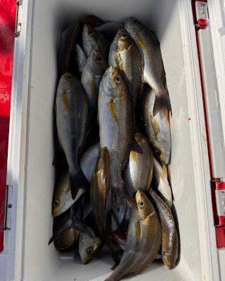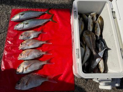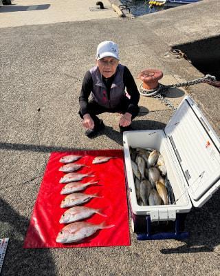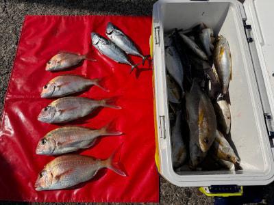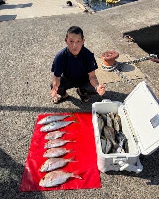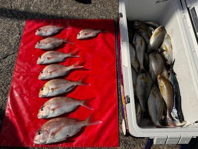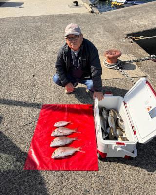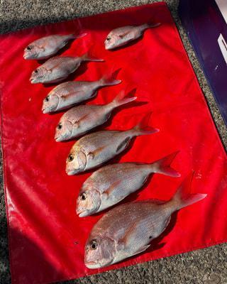 マダイ | 27〜43cm | 8匹 | 竿釣り 天秤フカセ ハリス5〜6号 4,5〜6b(3ヒロ〜4ヒロ)まで マダイ針10、11号 おもり100、120 オキアミ用コマセカゴ | オキアミ | |
