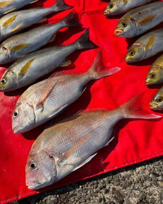 マダイ | 35〜43cm | 2匹 | 竿釣り 天秤フカセ ハリス5〜6号 4,5〜6b(3ヒロ〜4ヒロ)まで マダイ針10、11号 おもり120 オキアミ用コマセカゴ | オキアミ | |