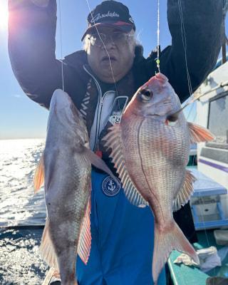 マダイ | 37〜47cm | 4匹 | 竿釣り 天秤フカセ ハリス5〜6号 4,5〜6b(3ヒロ〜4ヒロ)まで マダイ針10、11号 おもり120 オキアミ用コマセカゴ | オキアミ | |