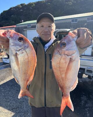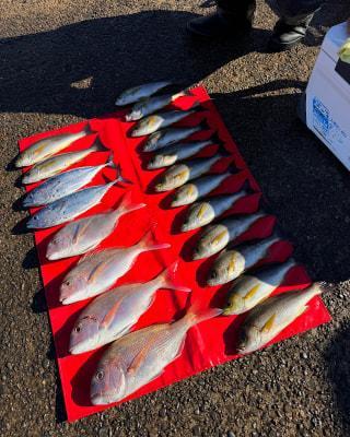 マダイ | 34〜43cm | 4匹 | 竿釣り 天秤フカセ ハリス5〜6号 4,5〜6b(3ヒロ〜4ヒロ)まで マダイ針10、11号 おもり120 オキアミ用コマセカゴ | オキアミ | |