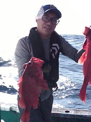 | 深海のアコウダイ釣りでした。 今日は風波ありましたねぇ〜。良型上がりましたがこの風では。また次回ですね。 |