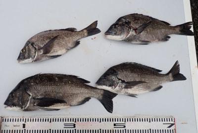 チヌ | 28〜37cm | 5匹 | フカセ釣り ウキ下2ヒロ ハリス1.5号 針・グレ5号 | オキアミ |