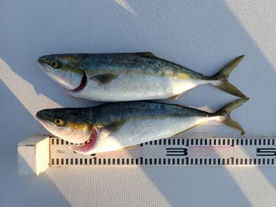 ハマチ | 45.5〜46cm | 2匹 | メタルジグ50g赤金 PE1.5号 リーダー2号 |