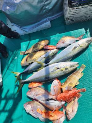 | タイラバ、ジギング便で出船。タイラバでマダイ35〜48まで5枚、ジギングでメジロ、ブリ、3本バラシあり!アオハタ、ウッカリ、アヤメでした。 |