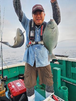 | ウメイロ便に出船。23〜28匹 他イサキ、グレ、サバ、タイ、キンムロでした。 |