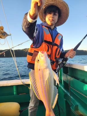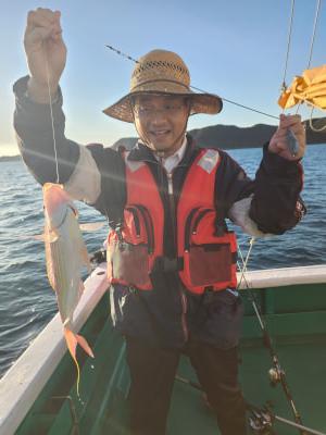 | エサ釣りに出船。浅場がいいとのことでイトヨリ狙い。イトヨリ大漁、他アオハタ、カイワリ、マダイでした。 |
