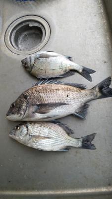 チヌ | 28〜36cm | 3匹 | ハリス1号 針グレ6号 オモリB 竿5.3m フカセ釣り | オキアミ |