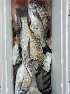 チヌ | 25〜40cm | 18匹 | ハリス1.5号 針4号 オモリ5B 竿1.6m | サナギ アサリ |