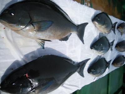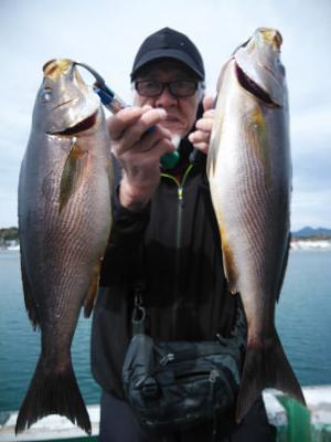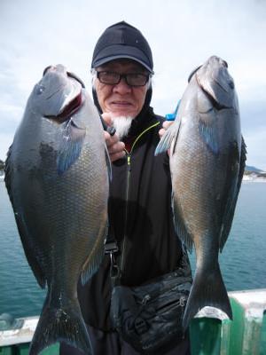 | 磯釣りスタイルのフカセ釣り。白浜沖でグレ釣りするなら大瀬丸へ。午前便の釣行でした。朝一番、北東の風で上り潮でした。よく頑張ってくれて寒グレ40cm頭に5目釣ってくれてよかったです。ありがとうございました。また、お願いします。 |
