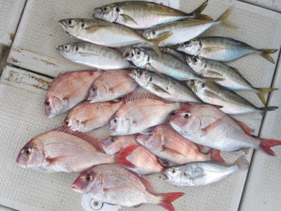 マアジ | 25〜30cm | 10匹 | 胴付き3本針 | 青虫・オキアミ |