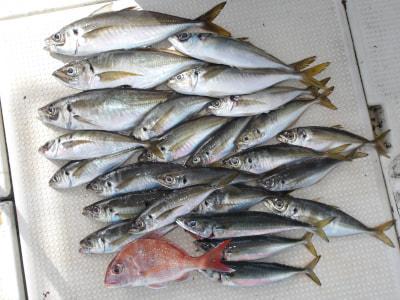 マアジ | 25〜45cm | 22匹 | 胴付き3本針 | 青虫・オキアミ |