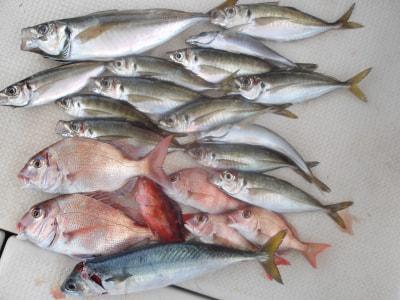 マアジ | 25〜45cm | 14匹 | 胴付き3本針 | 青虫・オキアミ |