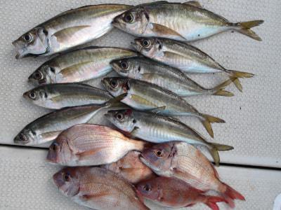 マアジ | 25〜35cm | 9匹 | 胴付き3本針 | 青虫・オキアミ |