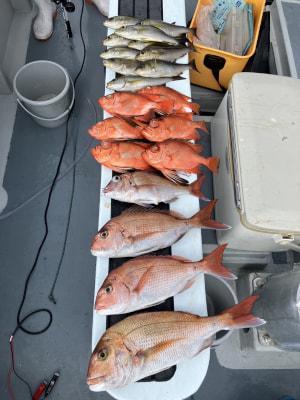 マダイ | 38〜54cm | 4匹 | 竿釣り、ハリス6号2本針、オモリ120 | オキアミ | |