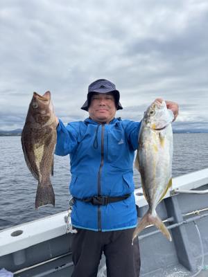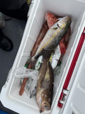 カンパチ、シオ、ツバス、アカヤガラ、オオモンハタ | 竿釣り、落とし込み仕掛け10号4本針、オモリ80 |