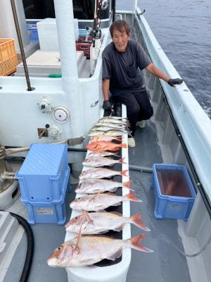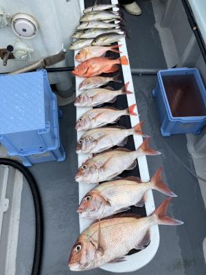 マダイ | 39〜53cm | 6匹 | 竿釣り、ハリス6号2本針、オモリ120 | オキアミ | |