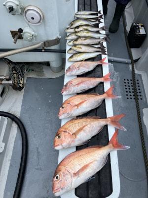 マダイ | 38〜53cm | 5匹 | 竿釣り、ハリス6号2本針、オモリ120 | オキアミ | |