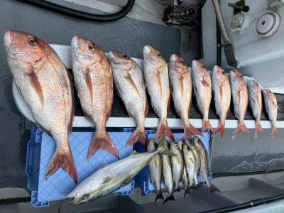 マダイ | 40〜63cm | 10匹 | 竿釣り、ハリス6号2本針、オモリ120 | オキアミ |