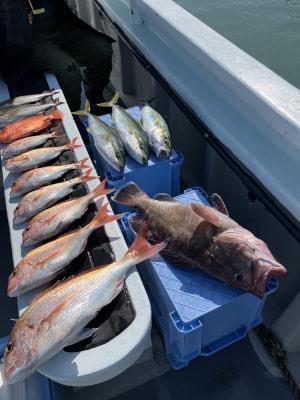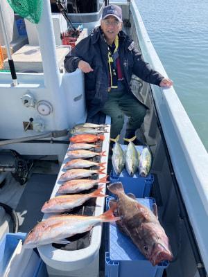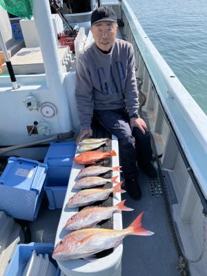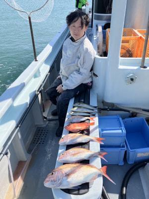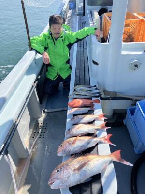 マダイ | 34〜55cm | 7匹 | 竿釣り、ハリス6号2本針、オモリ120 | オキアミ |