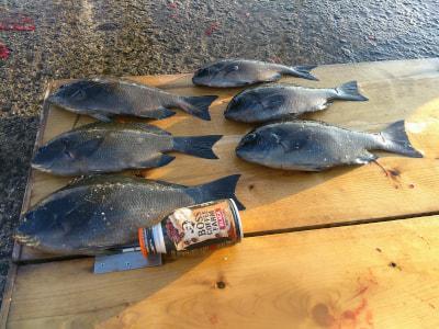 グレ | 30〜34cm | 5匹 | フカセ釣り ハリス1.7号 グレ針5号 ウキ下2ヒロ | オキアミ |