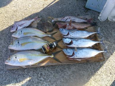 | 今日は風強く波の高い中よく頑張って頂きました。 岩代沖でヤイトガツオも混じってシマアジやシオも出ましたが、イサギは依然低調気味で…。 |