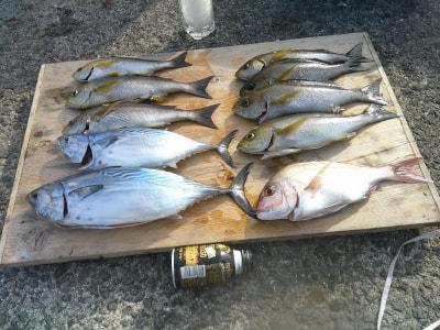 ヤイトガツオも5匹混じってイサギやアカハタ等魚種たっぷりと…! 泉大津市 堀内様2人の釣果 |